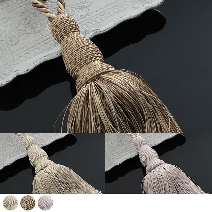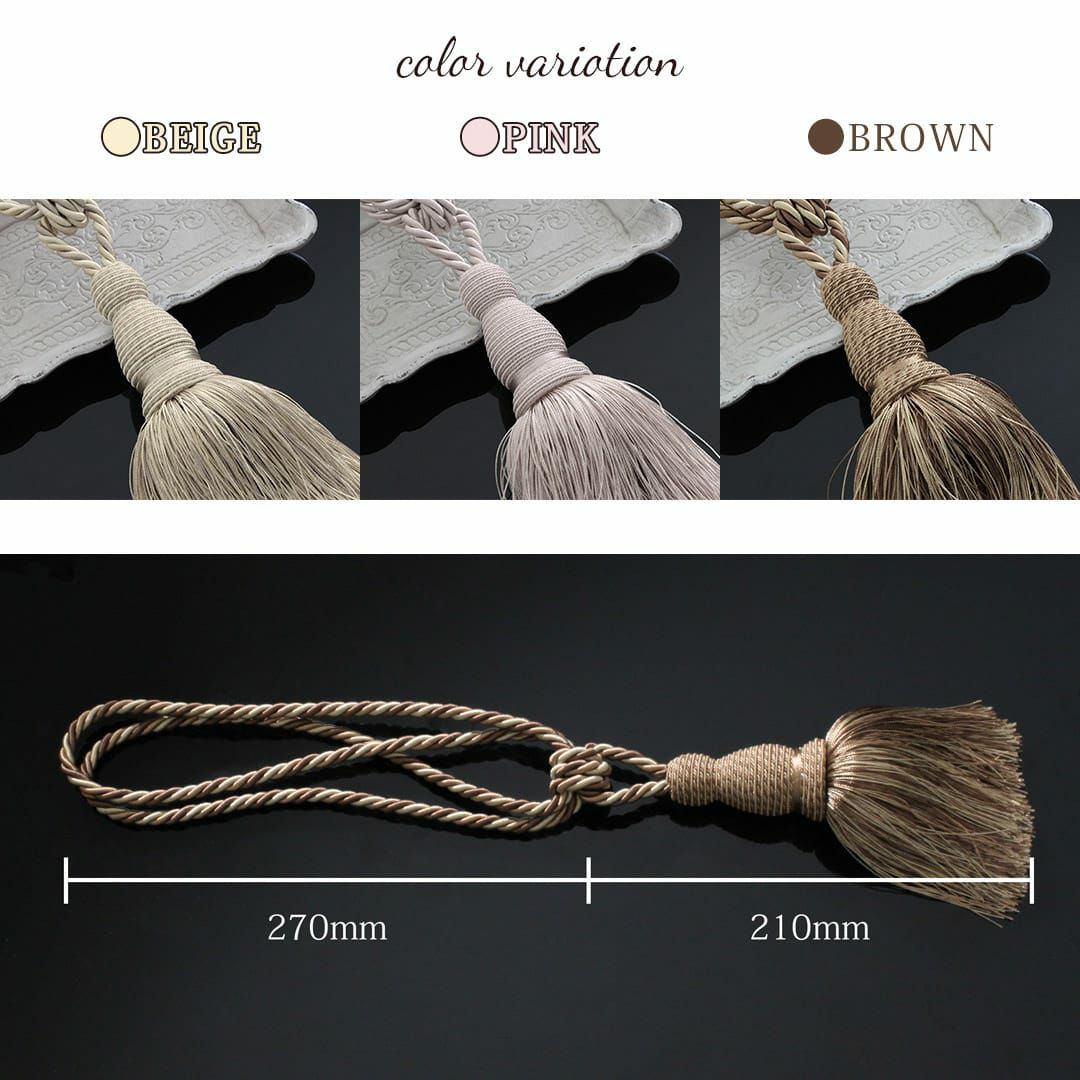 ピンクを購入しました。 カーテンと全く同じ色でピッタリです。 ツヤツヤ感が写真で伝わりますでしょうか。 とてもお洒落で品のあるタッセルです。 奥のレースは以前こちらで購入したトルコレースです。 こちらもドット柄の刺繍にキラキラする糸が使用されてるのでキラキラしてます。 ※写真のレース ふわふわボール(ベージュ)