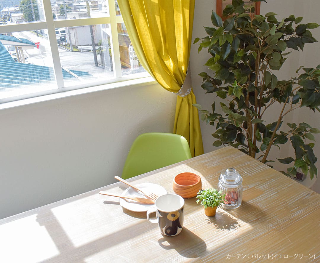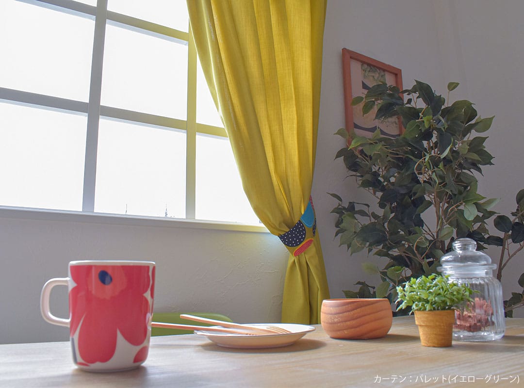 ▶コーディネートのカーテン(左):パレット(イエローグリーン)、(右)ニューマカロン(ココナッツ)
