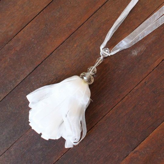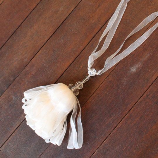 ふわふわしたリボンがタッセルになりました。 ふさかけがないお部屋でもカーテンをキュートにまとめてくれます。 キラキラ輝くビーズ付きでカーテンを開けて飾りたくなるスイートなタッセルです♪
