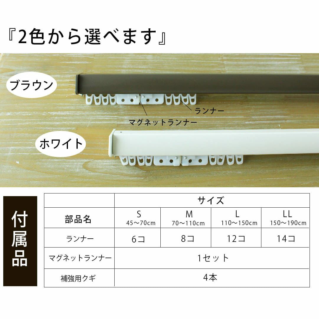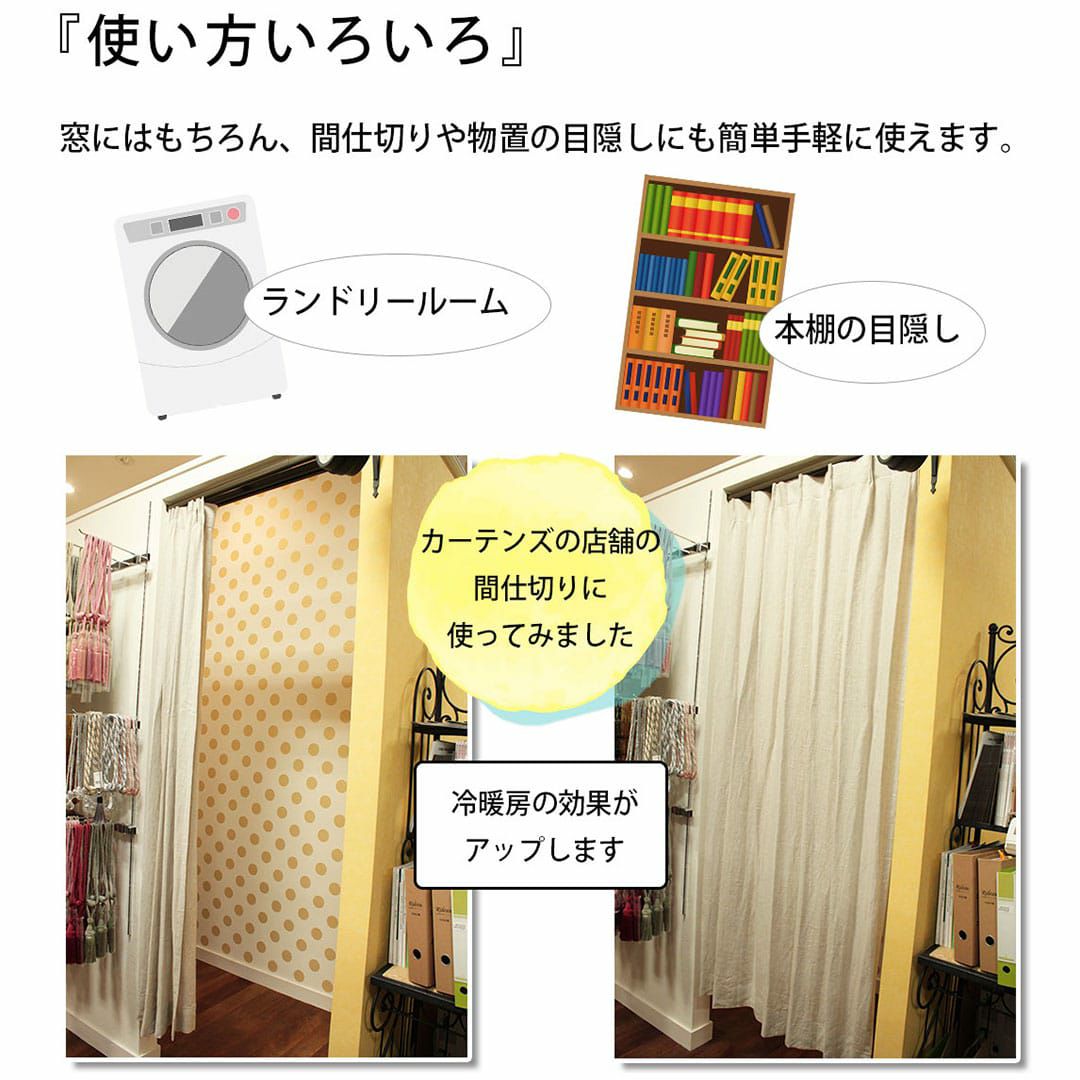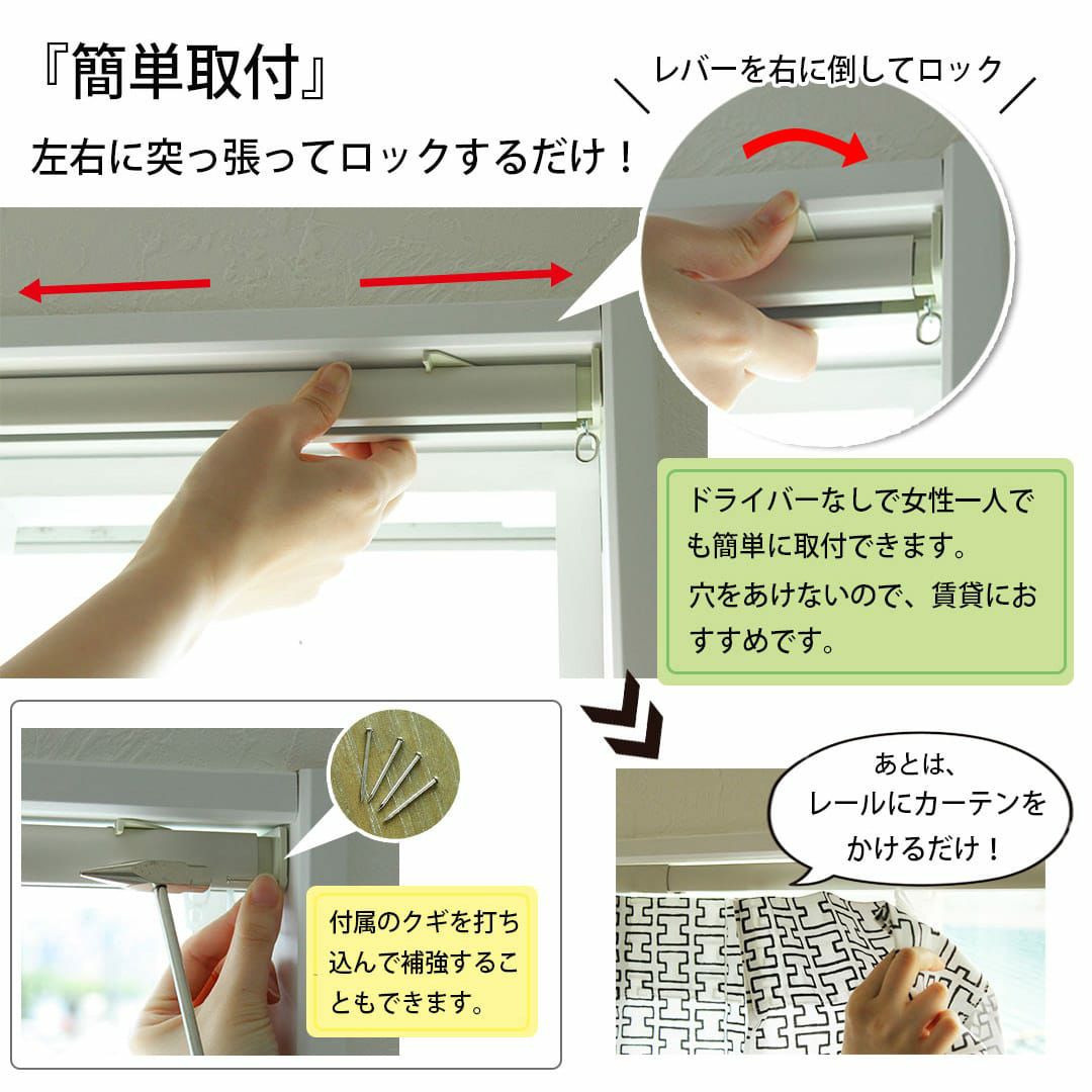 ドライバーなしで簡単に取付ができるレールです。 穴をあけないので賃貸にもおすすめです。 ちょっとしたスペースの目隠しや間仕切りにも使えます。 左右のレールキャップも取り外せますので ランナーを追加したり取り出したりすることも可能です!