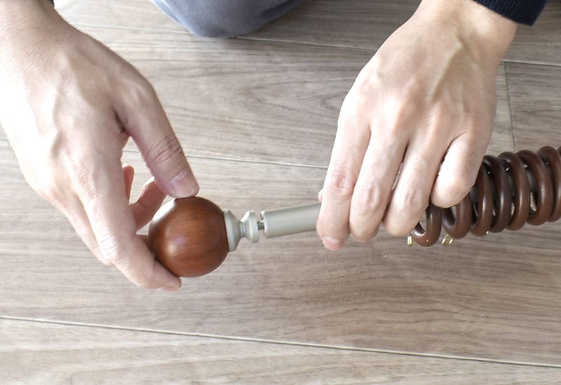 (3)フィニアルを回してはずし、リングランナーをセットし、フィニアルをつけます。カーテンのフックに合わせてランナーの数を入れます。多めにセットしてもよいですし、予備として保管してもよいです。