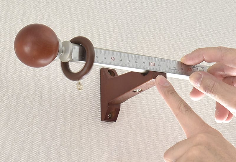 (5)ブラケットにレールを仮置きします。この時、両端のリングランナー1個ずつをブラケットの外側に置きます。その後、レールの長さやフィニアルの角度を調整しましょう。フィニアルを除いた約10cmを外側に出すのがおすすめです。