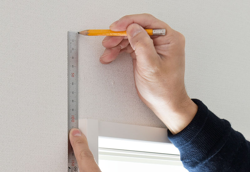 窓枠の延長上に10~12cmの高さにしるしをつけます。ブラケット位置は窓枠の幅に対して均等につけてください。