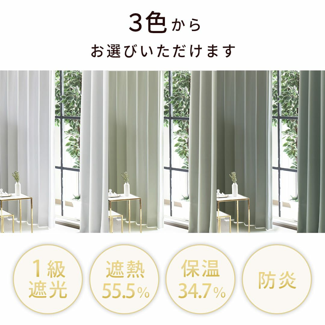 スノーグレーやアッシュグレーなどの淡い色は光を通しやすい性質があります。 同じ等級の遮光カーテンでも濃く暗い色は遮光性が高く、淡く明るい色は遮光効果が少し低く感じられます。 高い遮光性を重視する方は濃く暗い色のモスグレーがおすすめです。