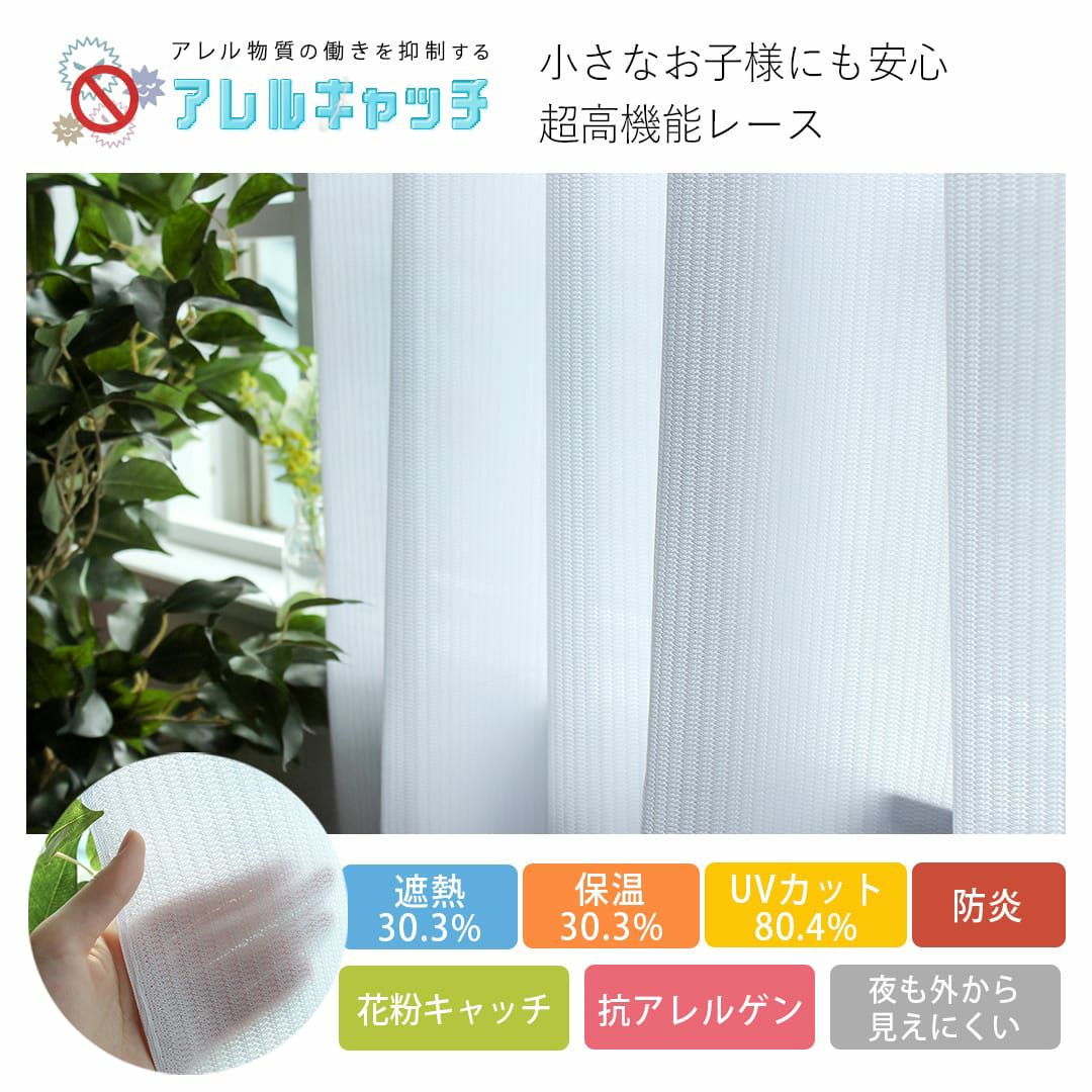 昼も夜も見えにくい遮像機能のついたミラーレースカーテン! 見えにくいだけではなく、日中嬉しいUVカット、省エネ&お財布にも優しい遮熱・保温機能と 小さなお子様にも安心の花粉キャッチ・抗アレルゲン加工つき。 さらにはいざという時に心強い防炎機能もついている超高機能レースカーテンです。 自宅の洗濯機で丸洗いできるので、長くお手軽にお使いいただけます。 ※商品名が「アレルクリーン」⇒「アレルキャッチ」に変わりました。生地は同一製品です。