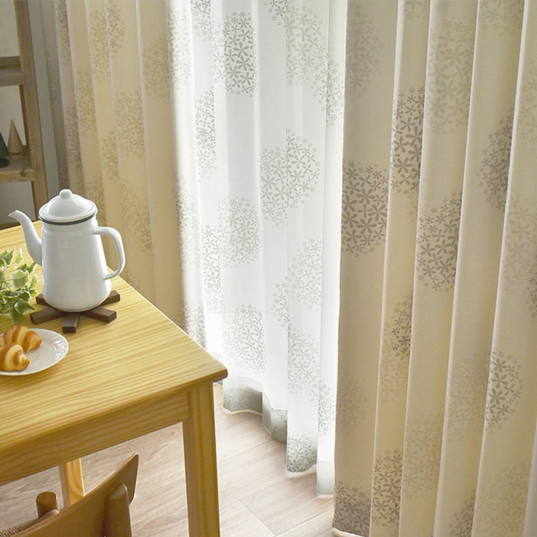 大きな丸いお花のシルエット。光で浮かび上がったように見えるさりげないシルエットがまるで森の中にいるような癒しの空間にしてくれます。 さらっと軽い肌触りのボイルレース生地で光を反射して屈折させる光沢糸「ウェーブロンプラス」を使用した機能性にも優れたボイルレースカーテンです。 しっかり目隠ししながら、光を取り込み、お部屋を明るく快適に保ちます。 昼も夜も外からの視線を遮り、プライバシーを守ります。