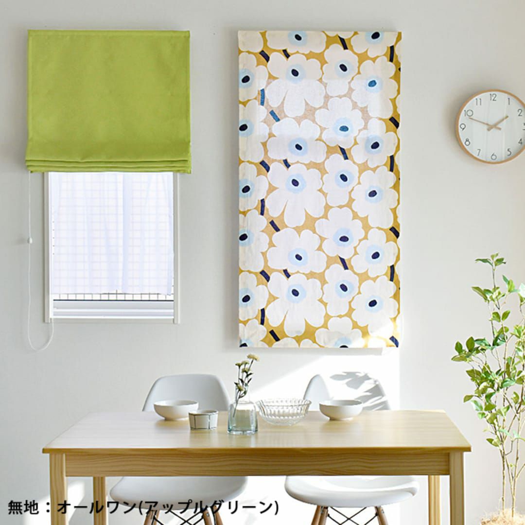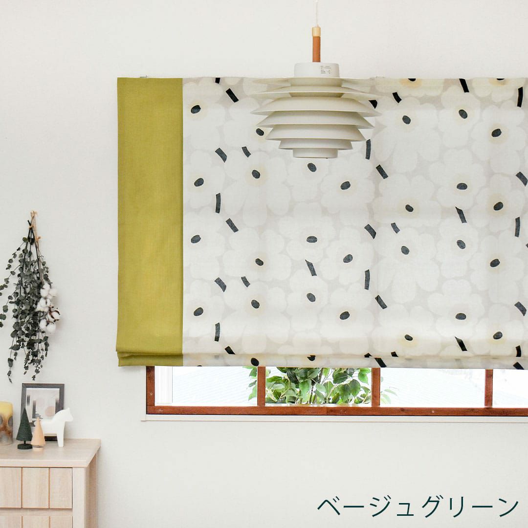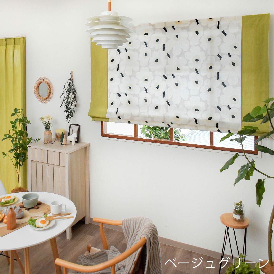 ▲こちらはパレット|ニュアンス&パステル(アンティークグリーン)の生地を使用してつなぎ合わせています。 両端に無地の生地をつなぐことでデザインがより映えてとても素敵ですよ。 ※写真のシェードカーテンのサイズは幅181cm×高さ125cmです