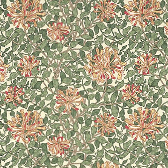 モリスの娘のデザイン。 斜め方向に流れがあり、隣接する葉が絡み合う複雑なデザインは、 12の木版からなるオリジナルのハンドプリント壁紙のスタイルを反映している。