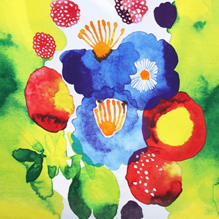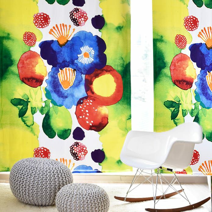 ユハンヌスタイカは「真夏の魔法」という意味。 まさに夏らしいトロピカルなカラーのデザイン。 色鮮やかな水彩画風に描かれた迫力のある花柄。 お部屋全体が明るく華やかな雰囲気になります。 タペストリーとして使用するのもおススメです。 デザイナー:アイノ-マイヤ・メッツォラ