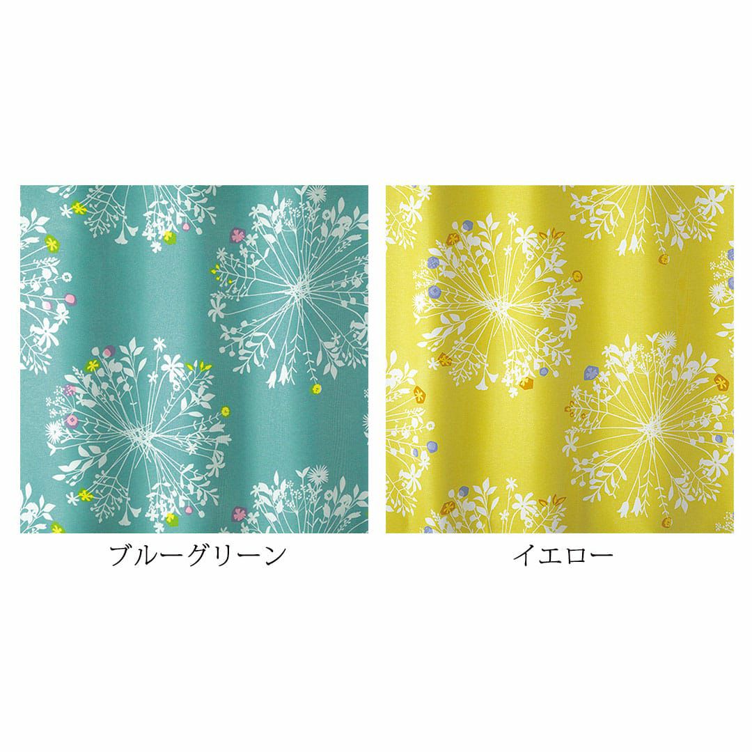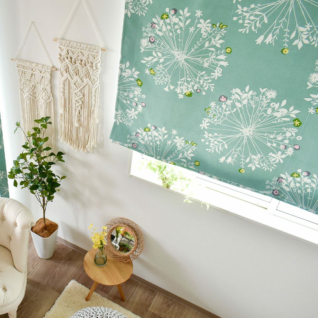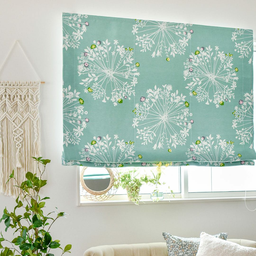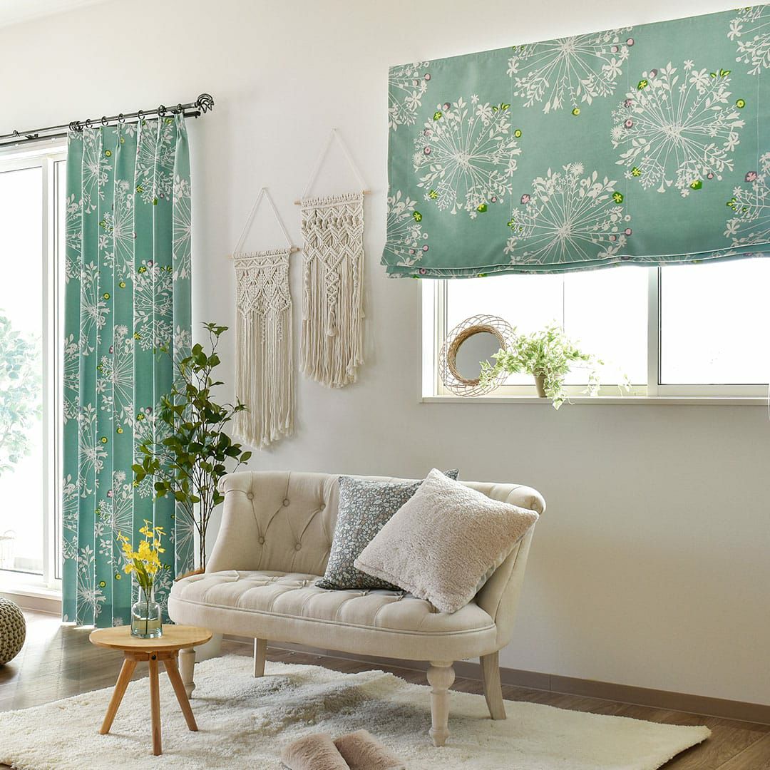 大きくて優しい花束のモチーフがいっぱい。 繊細なボタニカルデザインは、 白木のインテリアや窓に似合います。 ちょっとしたアクセントカラーが効いています。 遮光2級なので眩しい朝日や西日をほどよく遮ってくれますよ。
