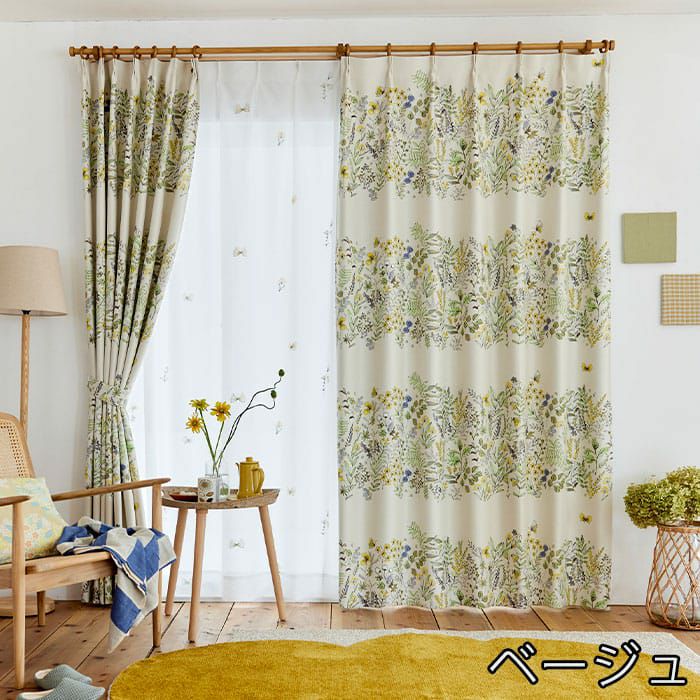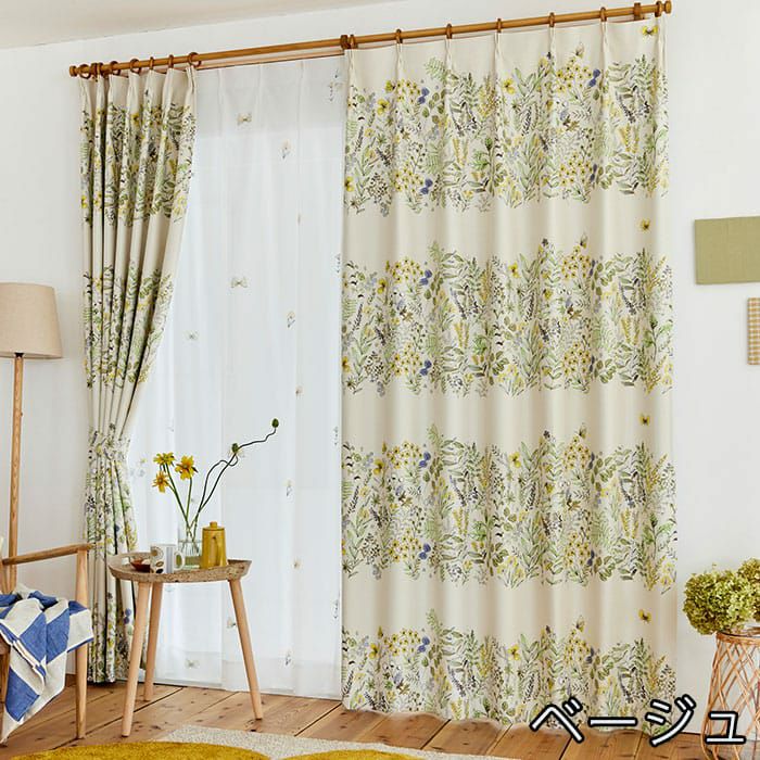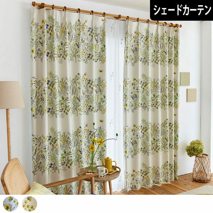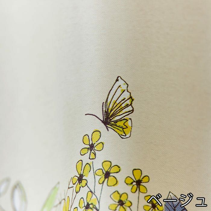 道端に咲く植物や蝶をデザインした2級遮光シェードカーテン。 近くから見ると、ラフな花々のイラストが可愛いらしく、 遠くから見るとイラストで構成した大きなボーター柄に。 ほっとする優しいタッチのデザインが寝室やリビングに最適です。