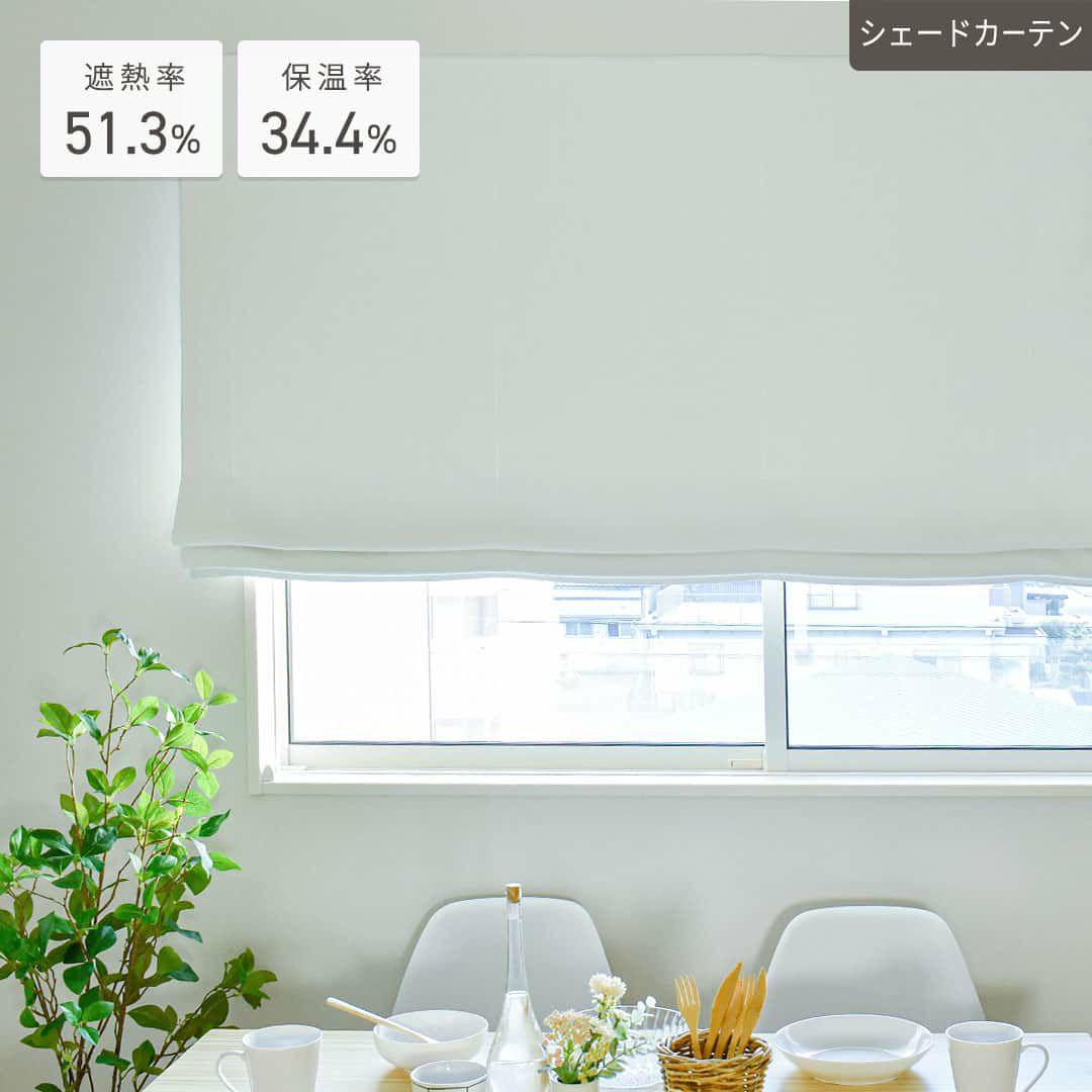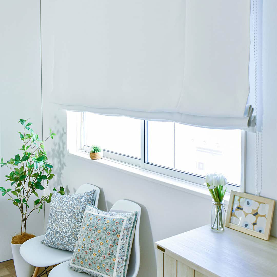 真っ白で1級遮光・防炎・高い遮熱・保温効果のあるまさにパーフェクトな機能を備えたホワイト生地を使ったシェードカーテン。 お部屋をスッキリとさせ広くみせてくれます。