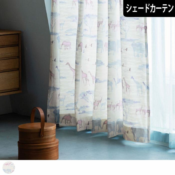 動物たちの大群がまるでアフリカのサファリにいるよう。 水彩画のような優しく淡いタッチで描かれているので 大人でも楽しめるデザインです。 淡い色合いが夕日に映えてかわいくも美しいカーテンです。