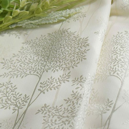 地はホワイト系のナチュラルなアイボリー、シラカバは光沢のあるシルバーの糸で品があり高級感があります。 ポリエステル100%生地なのでご自宅で洗濯ができお手入れ簡単です。