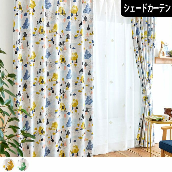 ▲グリーン 雪山で暮らしている様子、スキーを楽しんでる様子が描かれています。 柄の目を追っていくのが楽しくなるデザインです。 木目調の家具や観葉植物など、カジュアルな部屋によく合います。 ※写真は全て1.5倍ヒダ+形状記憶です。