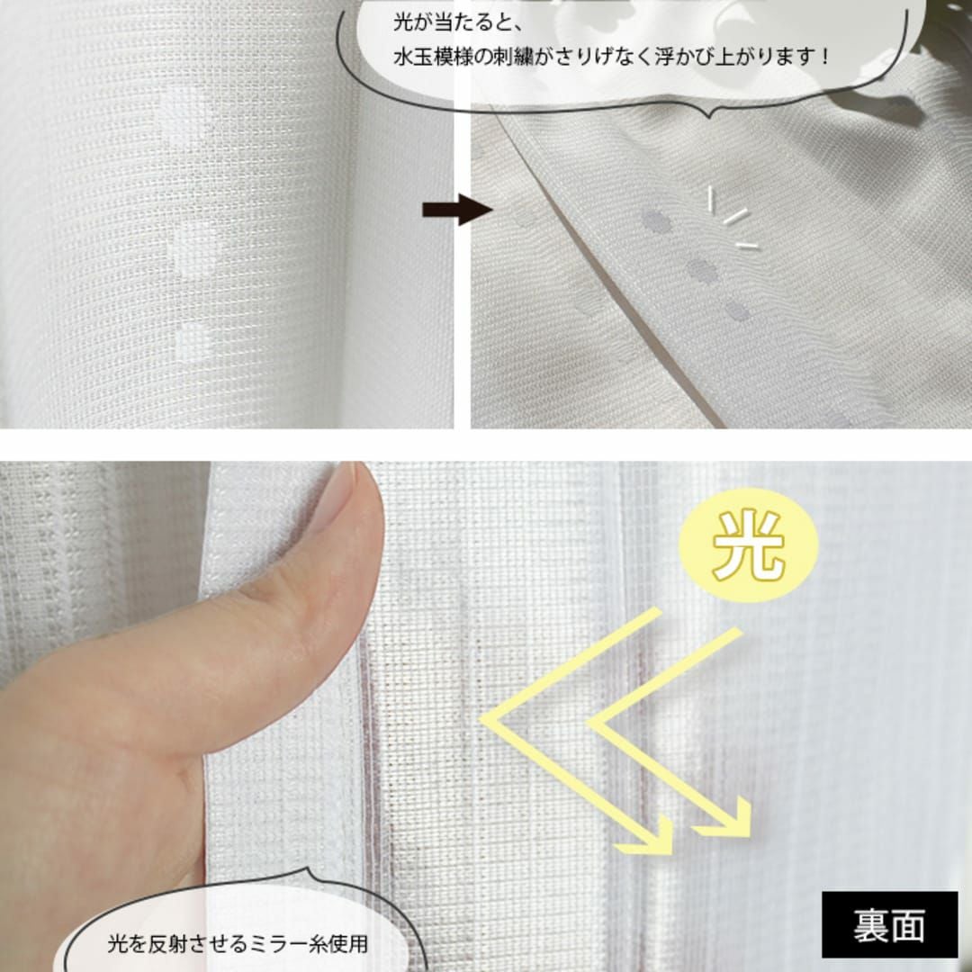 光を反射して屈折させる光沢糸「ウェーブロンプラス」を使用したレース しっかり目隠ししながら、光を取り込み、お部屋を明るく快適に保ちます。 夜も外からの視線を遮り、プライバシーを守ります。