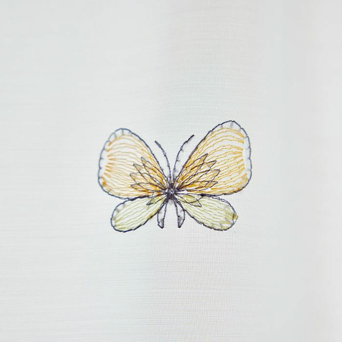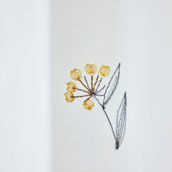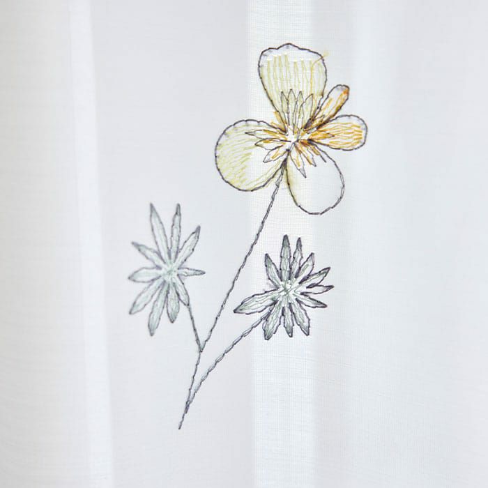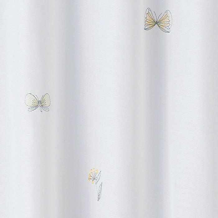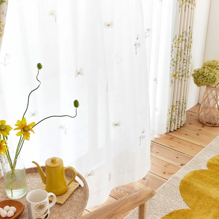 様々なお花や蝶の刺繍がデザインされています。 かわいらしい花や蝶のシルエットに癒されるデザイン。 優しげな北欧風ボイルレースシェードカーテン。