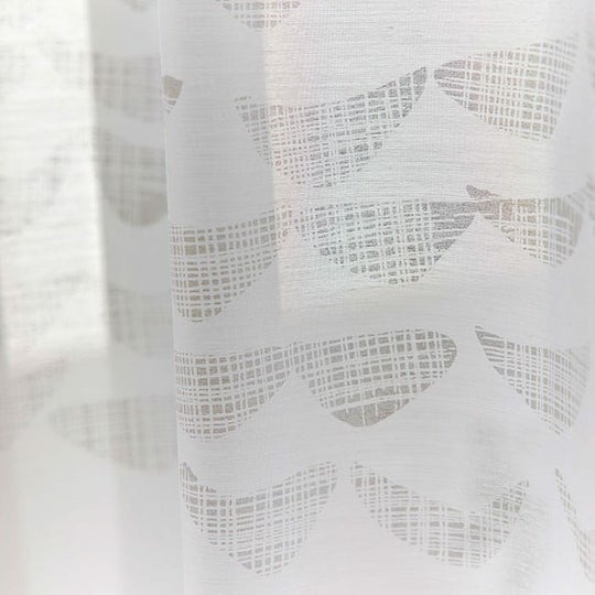 手書き風のかわいい波柄プリントがボーダー上に並んでいて、まるで海の波打ち際のようなデザイン。優しげな北欧風ボイルレースシェードカーテンです。波の部分は格子柄がちょっとしたアクセントになっています。