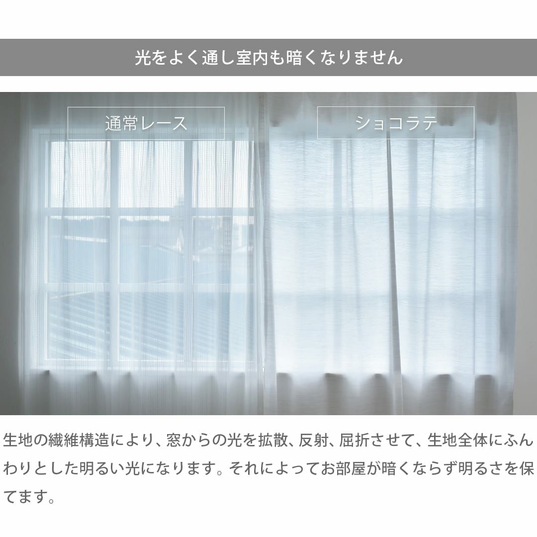 光を反射して屈折させる光沢糸「ウェーブロンプラス」を使用したボイルレース しっかり目隠ししながら、光を取り込み、お部屋を明るく快適に保ちます。 夜も外からの視線を遮り、プライバシーを守ります。 生地も柔らかく、風になびくような薄さが魅力です。