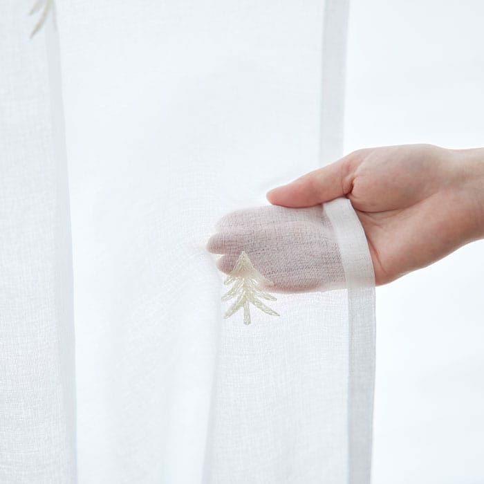 針葉樹と雪山で暮らすイエティがモチーフです。 スパン糸を使って刺繍することで、雪を連想させる柔らかなテクスチャーとなっています。 ドレープカーテン『ユキヤマ』とのコーディネートがおすすめです。