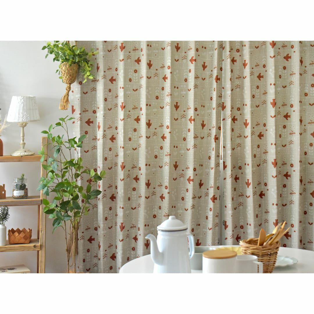 自由に描いた線と、刺繍のような鳥とお花をプリントしたカーテン。 ざっくりとしたベージュ生地にブラウンの鳥と、ブラウンと白の線で描かれたお花がアクセントになっています。 カジュアルテイストのお部屋に合います。