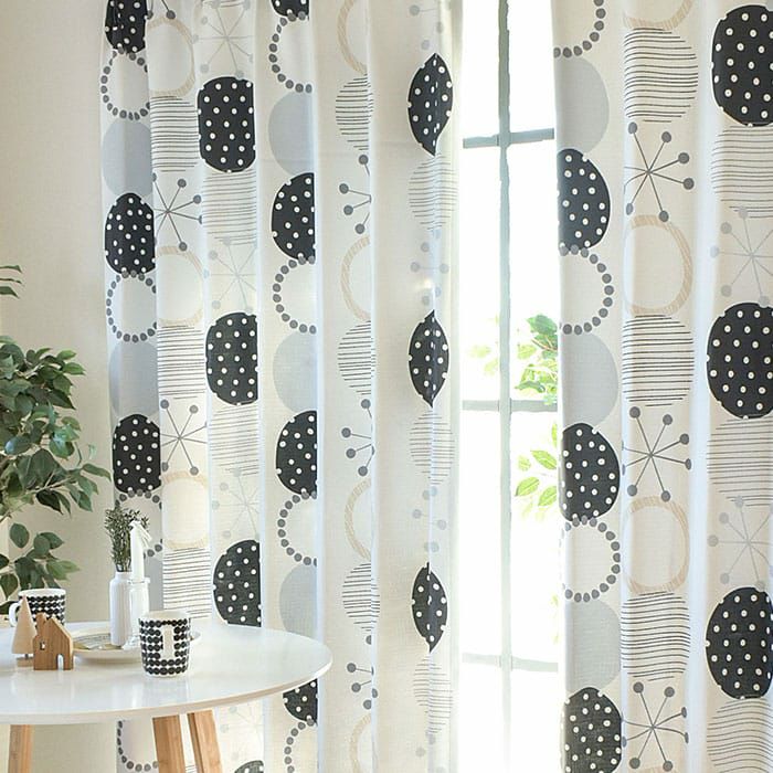※写真は全て1.5倍ヒダ(形状記憶付き)です。 当店のオリジナルデザインなのでここだけしか買えません! かわいい丸柄にモノトーンな色合いが モダンな印象を与えてくれる北欧ライクなカーテンです。