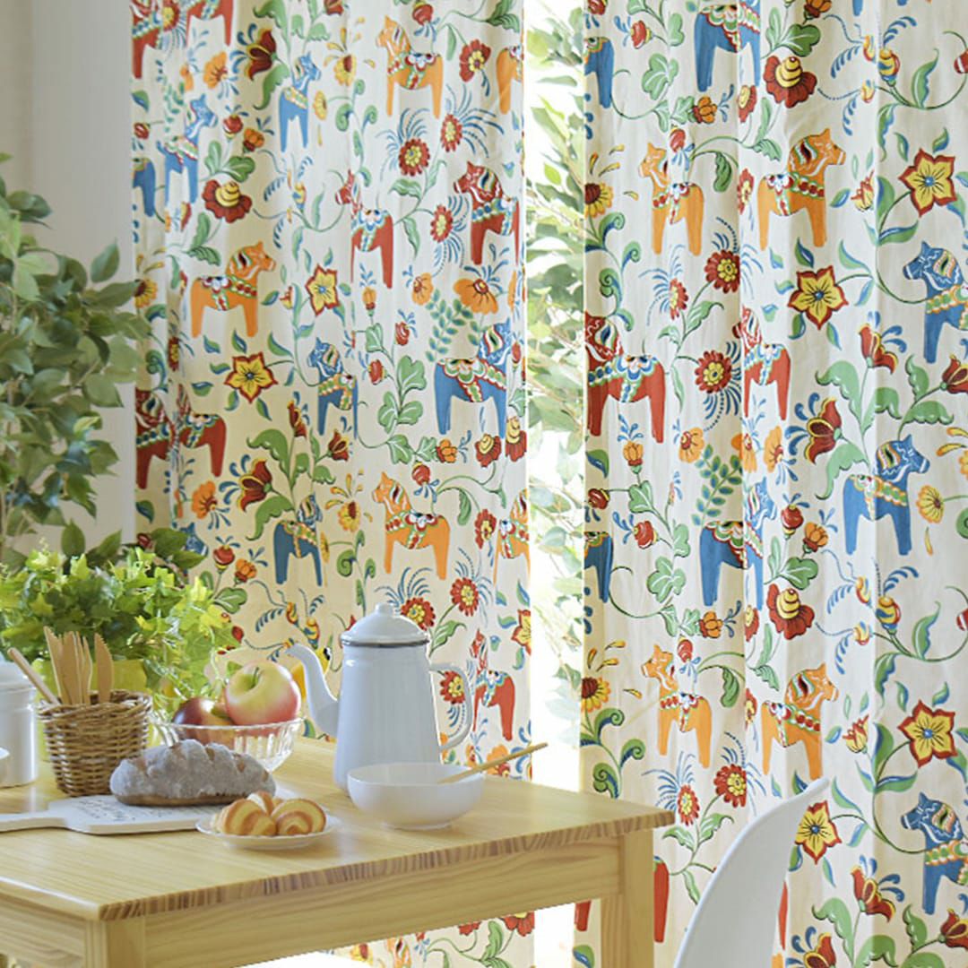 ▲ベージュ 横幅100cm×高さ180cm 2枚 フラット仕様(遮光裏地付) ダーラヘストは、スウェーデン・ダーラナ地方発祥の伝統工芸品の木彫りの馬で、日本では「ダーラナホース」という名前でも紹介されています。 北欧らしい色味とデザインが魅力的です。