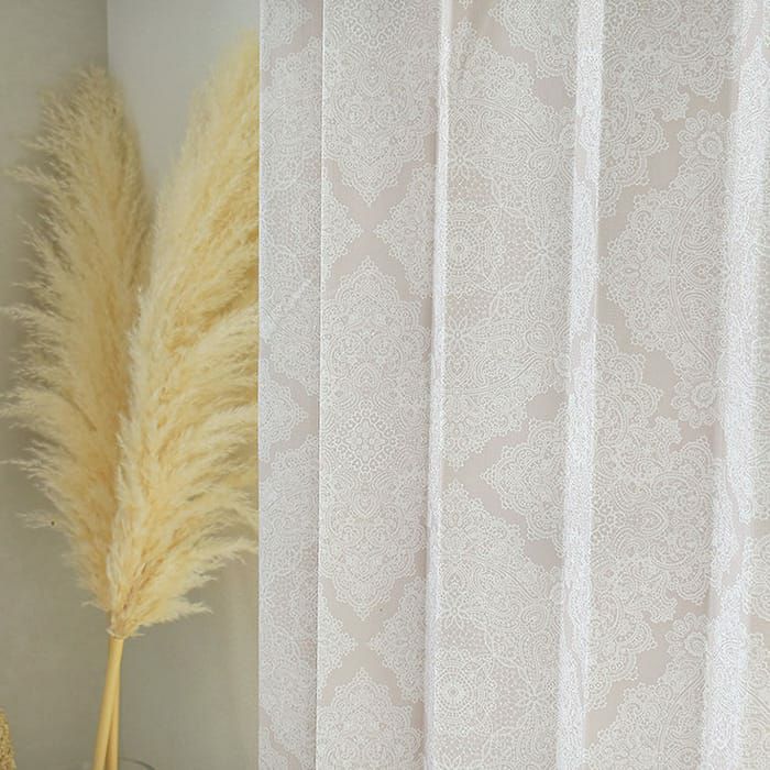 柄がお部屋に馴染むベージュなので取り入れやすいです。 レースのような細かなデザインがほのかに浮かび上がって見えます。