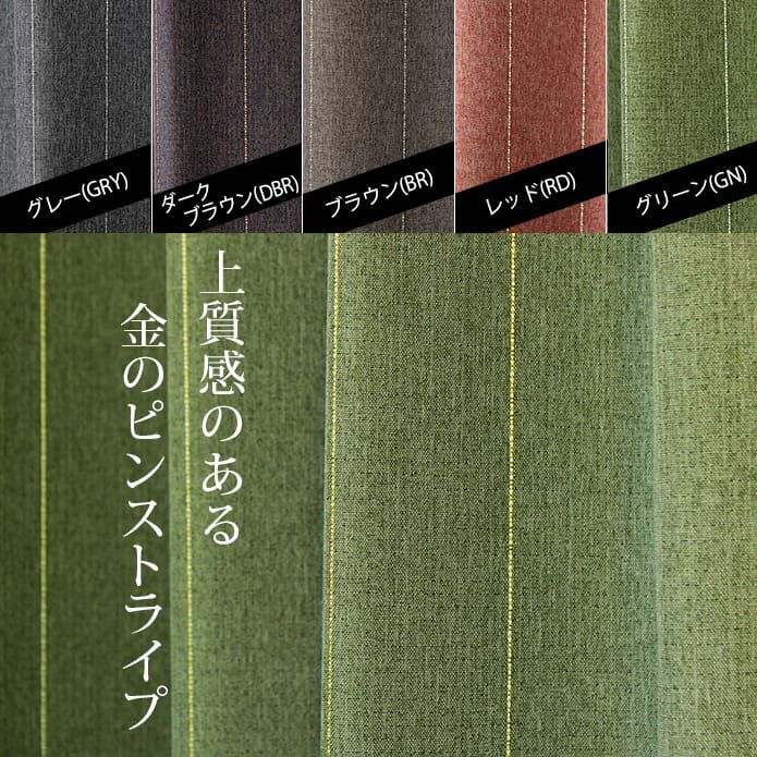 品のよい杢調の無地に金のピンストライプ 落ち着いた色合いとわずかなストライプが大人の部屋を演出します。 ほどよい遮光で暗すぎず明るすぎないお部屋にいかがですか? おさまりのよいドレープを出す形状記憶加工付きがおすすめです。