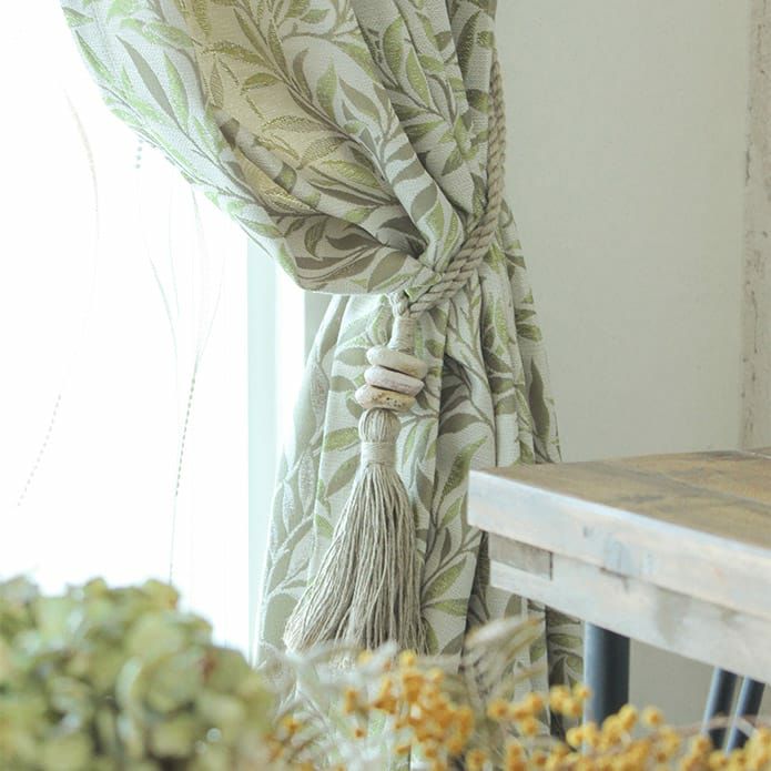 ▲タッセル:ふたさらさら(エメラルドグリーン)、レース:トルコレース リップル(グレー) ※写真は2倍ヒダです。 一面リーフ柄のクラシックなボタニカルデザインのカーテン。 優しく明るい色合いとナチュラルな風合いでリビングにぴったり! シャビーな雰囲気のお部屋や、シンプルでシックな北欧インテリア、和室にもマッチします。