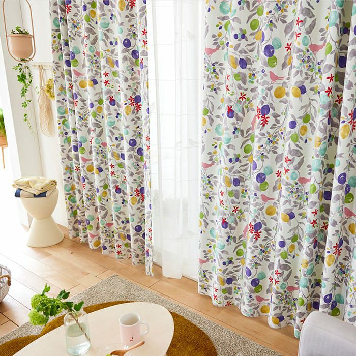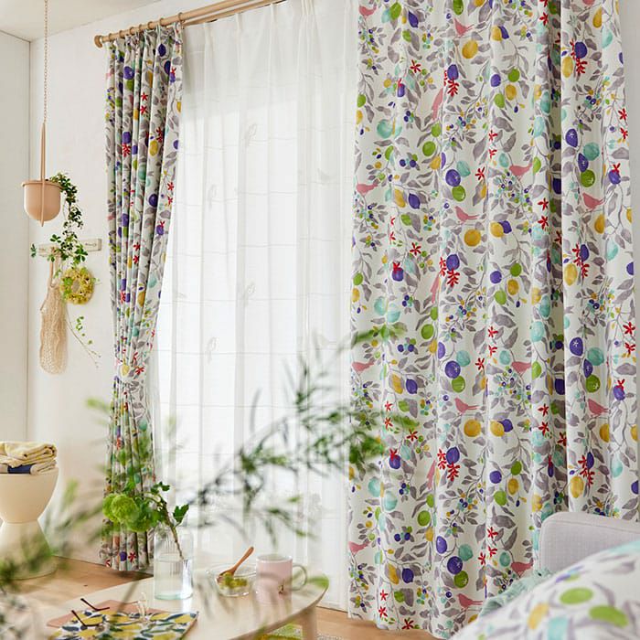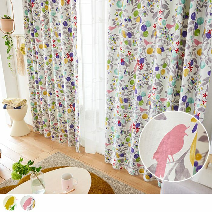 フルーツや木の実の中に小鳥が楽しげに鳴いているデザインを 華やかなカラーで表現している愛らしい北欧遮光カーテン。 ポップなデザインとカラーの組み合わせでお部屋が華やかになります。 ※写真は全て1.5倍ヒダ+形状記憶です。