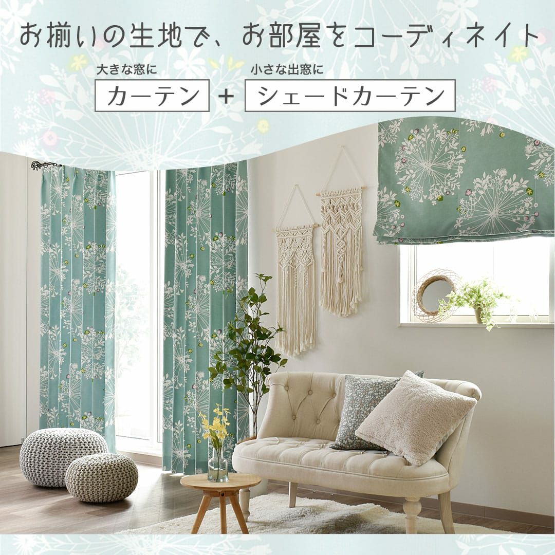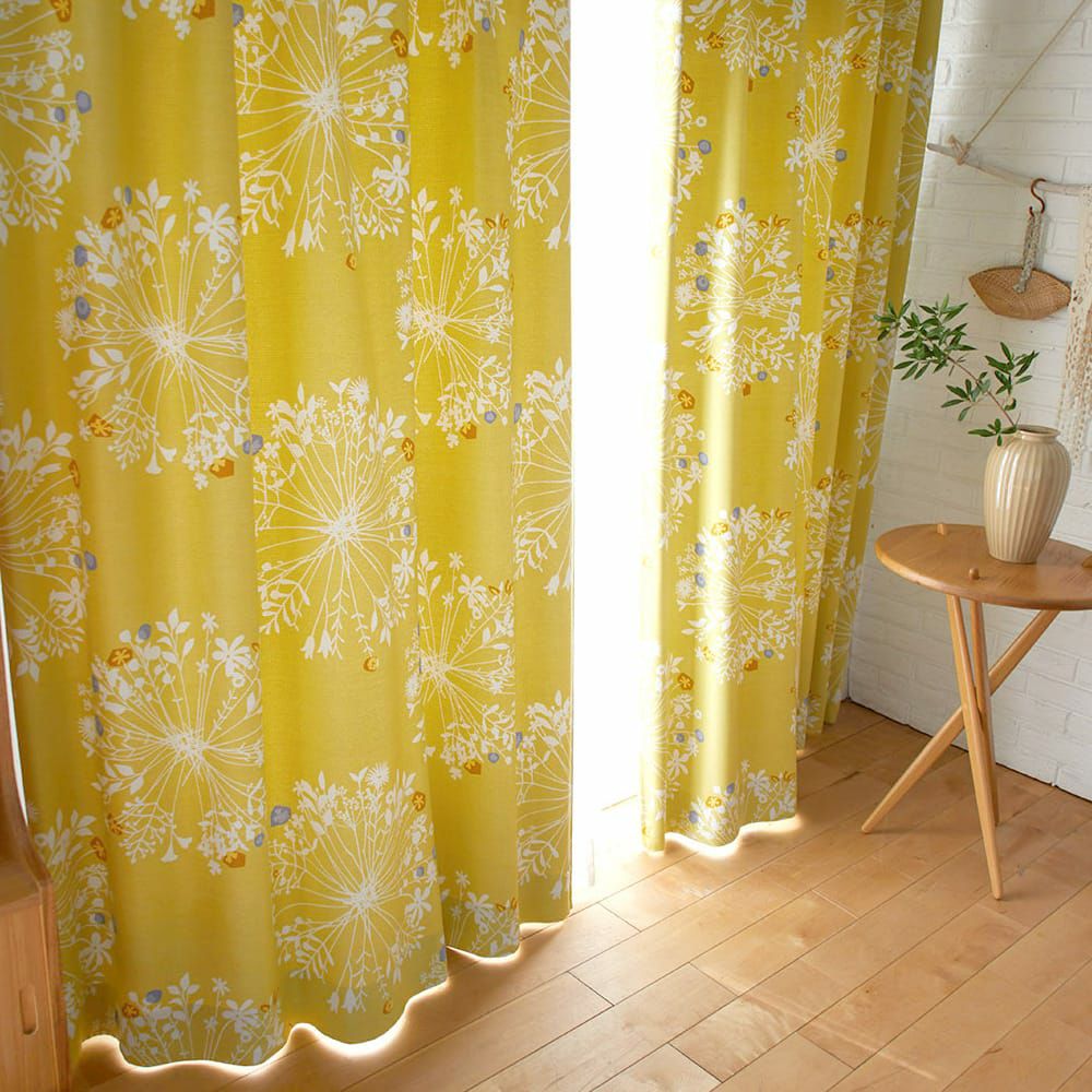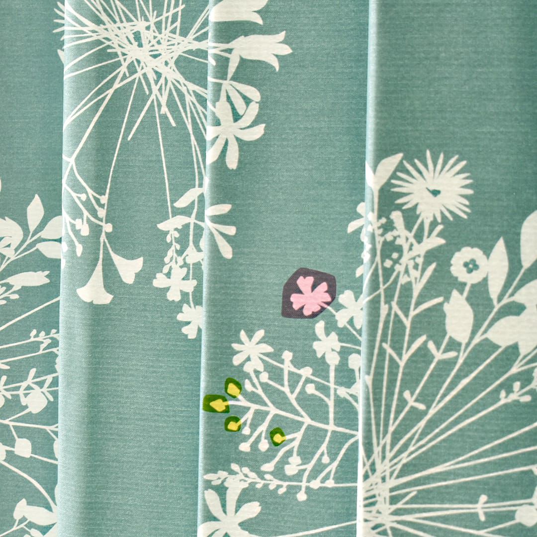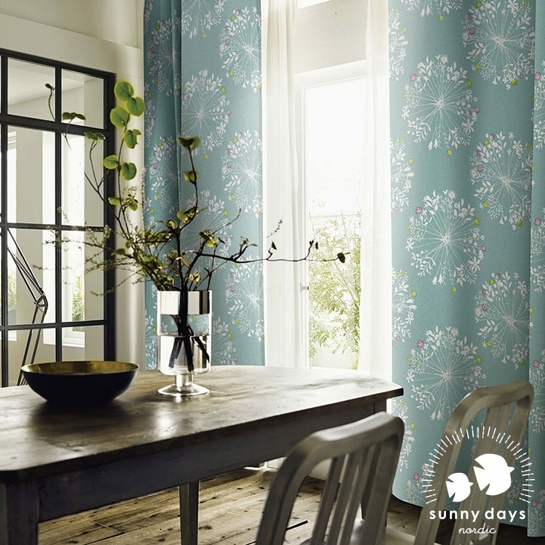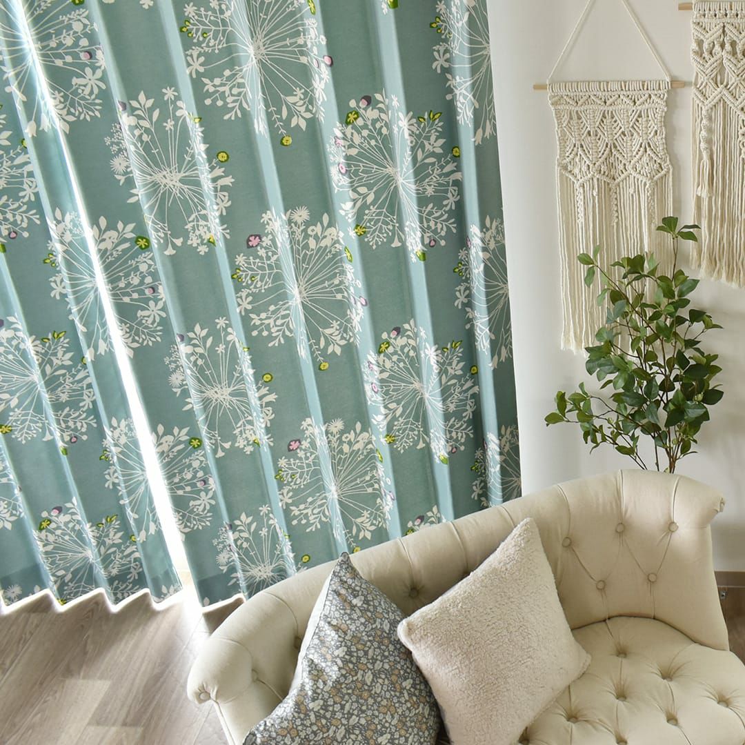 大きくて優しい花束のモチーフがいっぱい。 繊細なボタニカルデザインは、 白木のインテリアや窓に似合います。 ちょっとしたアクセントカラーが効いています。 遮光2級なので眩しい朝日や西日をほどよく遮ってくれますよ。