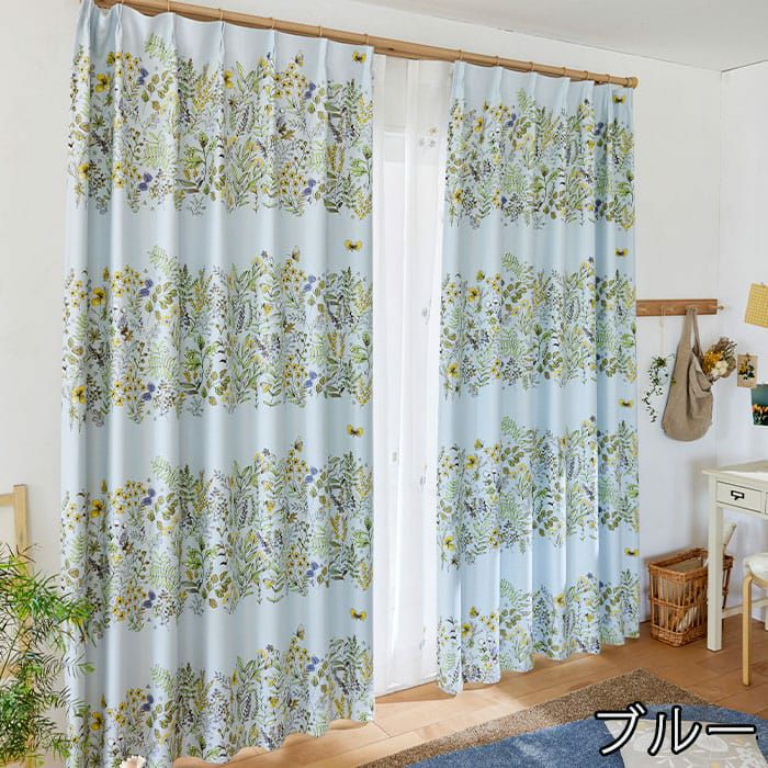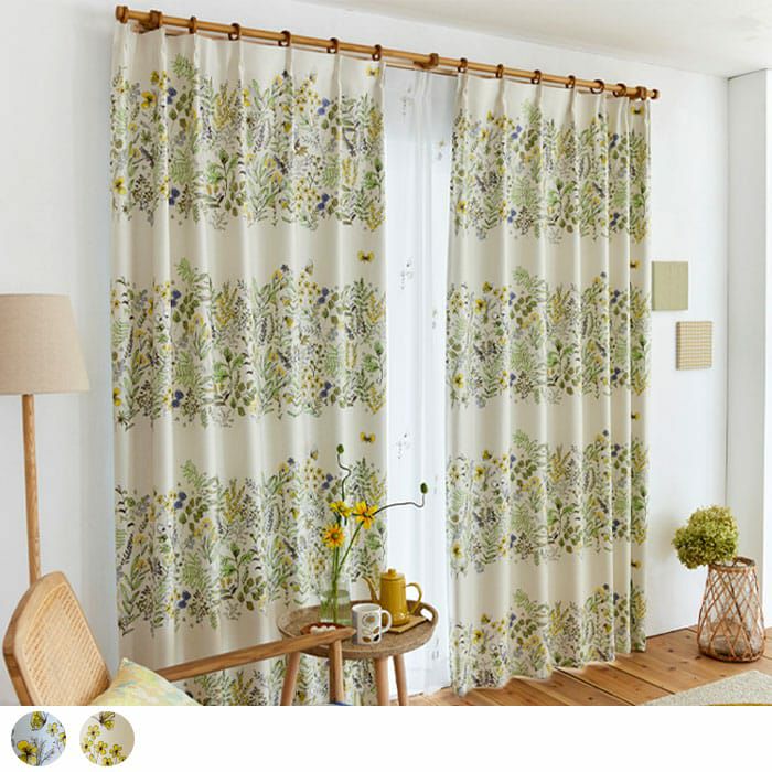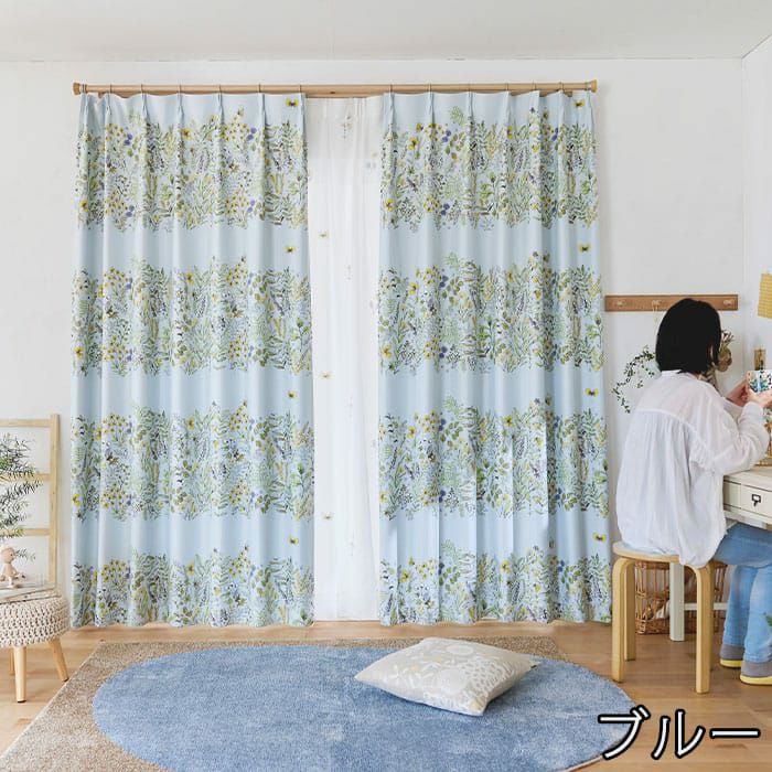 道端に咲く植物や蝶をデザインした2級遮光ドレープカーテン。 近くから見ると、ラフな花々のイラストが可愛いらしく、 遠くから見るとイラストで構成した大きなボーター柄に。 ほっとする優しいタッチのデザインが寝室やリビングに最適です。 ※写真は全て1.5倍ヒダ+形状記憶です。