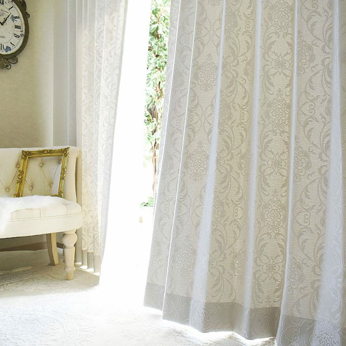 クラシカルな王朝柄が浮かび上がりヨーロピアンなお部屋にしてくれるカーテンです。ホワイトのカーテンはお部屋を広く明るく見せ清潔感のある空間にしてくれます。