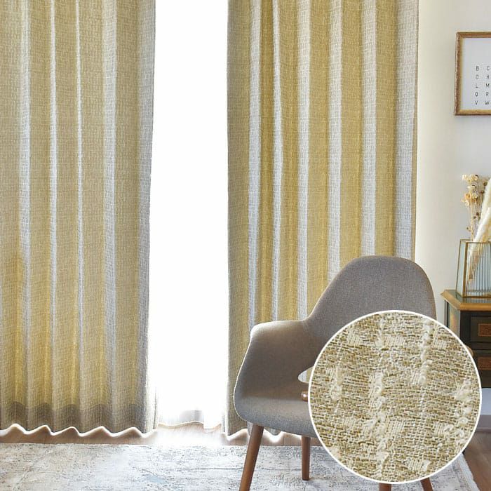 ▲ベージュ ナチュラルな手触りに凸凹とした光沢のある生地が特徴のカーテンです。遮光3級なので程よく光を遮ってくれます。 カーテンを開けてもアクセントのタッセルで窓回りを華やかに!