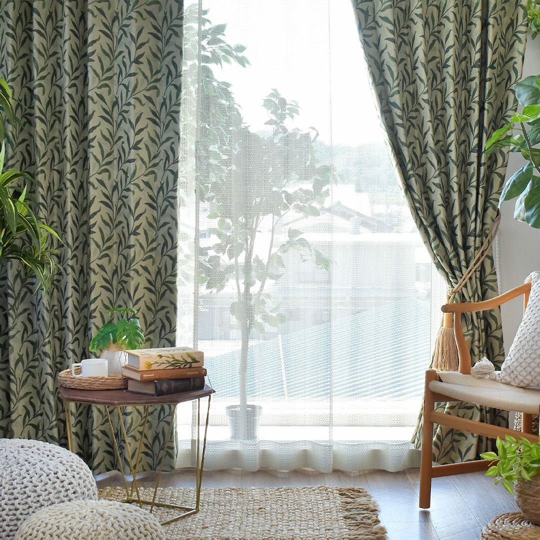 涼しげな水彩風のリーフ柄がおしゃれ!絵羽柄ボイルレースカーテン