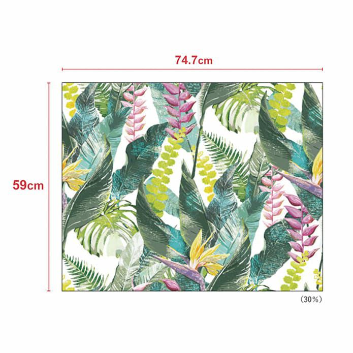 グリーンを基調にピンクやイエローがアクセントになった総柄の南国リーフデザインカーテン。