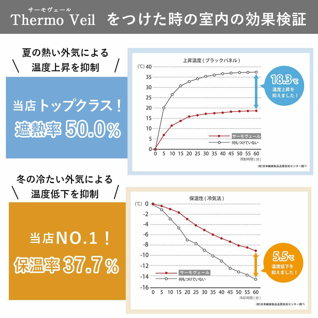 この試験で得られる「断熱(遮熱)効果率」は、カーテンが室内温度の上昇をどれだけ抑えられるかを示す指標です。比較の結果、「サーモヴェール」は18.3℃温度上昇を抑えていることがわかります。
