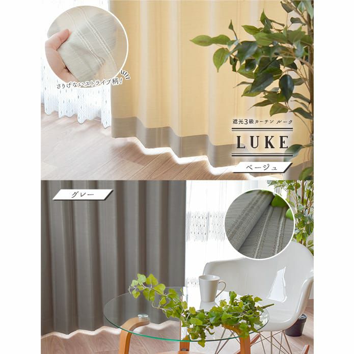 柔らかな印象のナチュラルベージュ 織りで表現されたストライプ柄がやや光沢のある生地に映えて上品な印象です。 ふんわりと光を通す遮光3級なのでリビングにも寝室にもおすすめ。 どんなインテリアにも合うベーシックなデザインです!