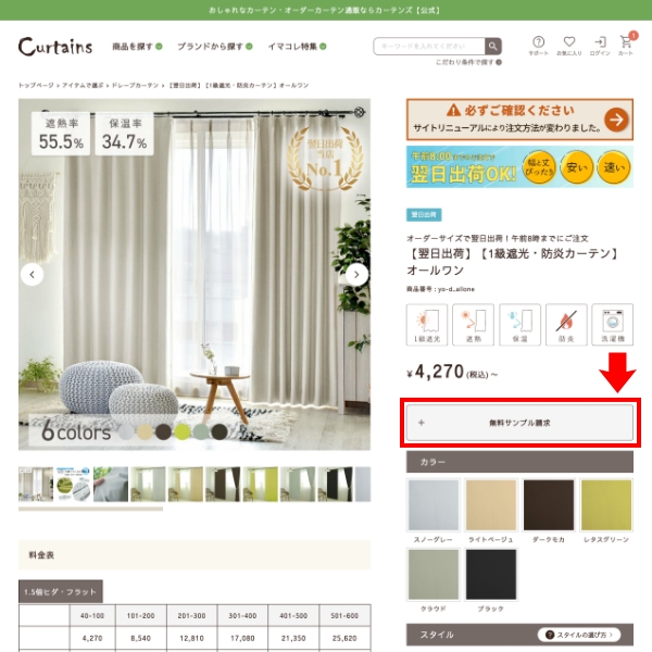 サンプル希望の商品ページの「無料サンプル生地を請求する」ボタンをクリック
