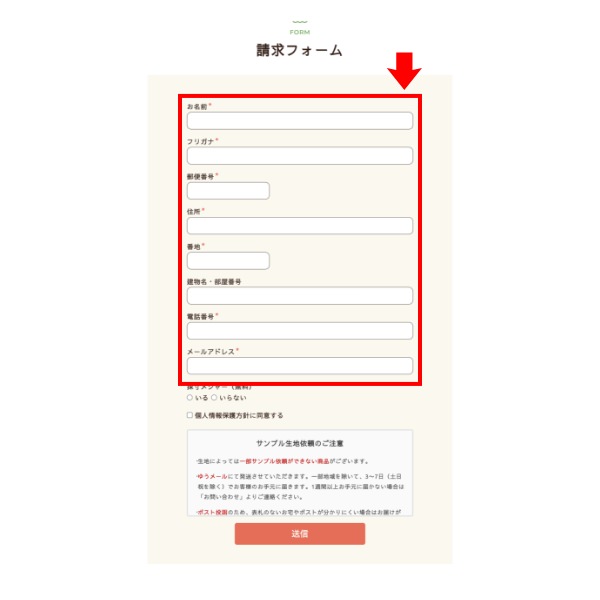 サンプル請求フォームにお客様情報をご入力の上送信