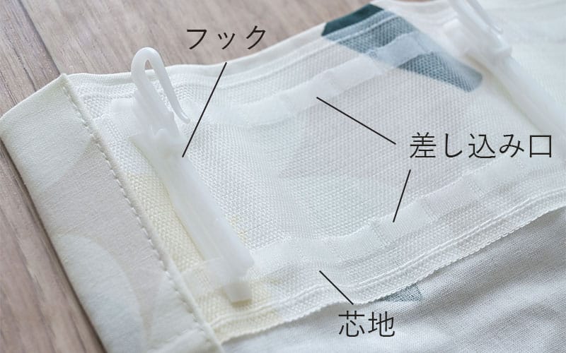 フラットスタイルの場合は上部の芯地にフックを差し込む仕様になっており、差し込み口の間隔により、フック間でのご注文サイズと少しずれてしまう場合があります。