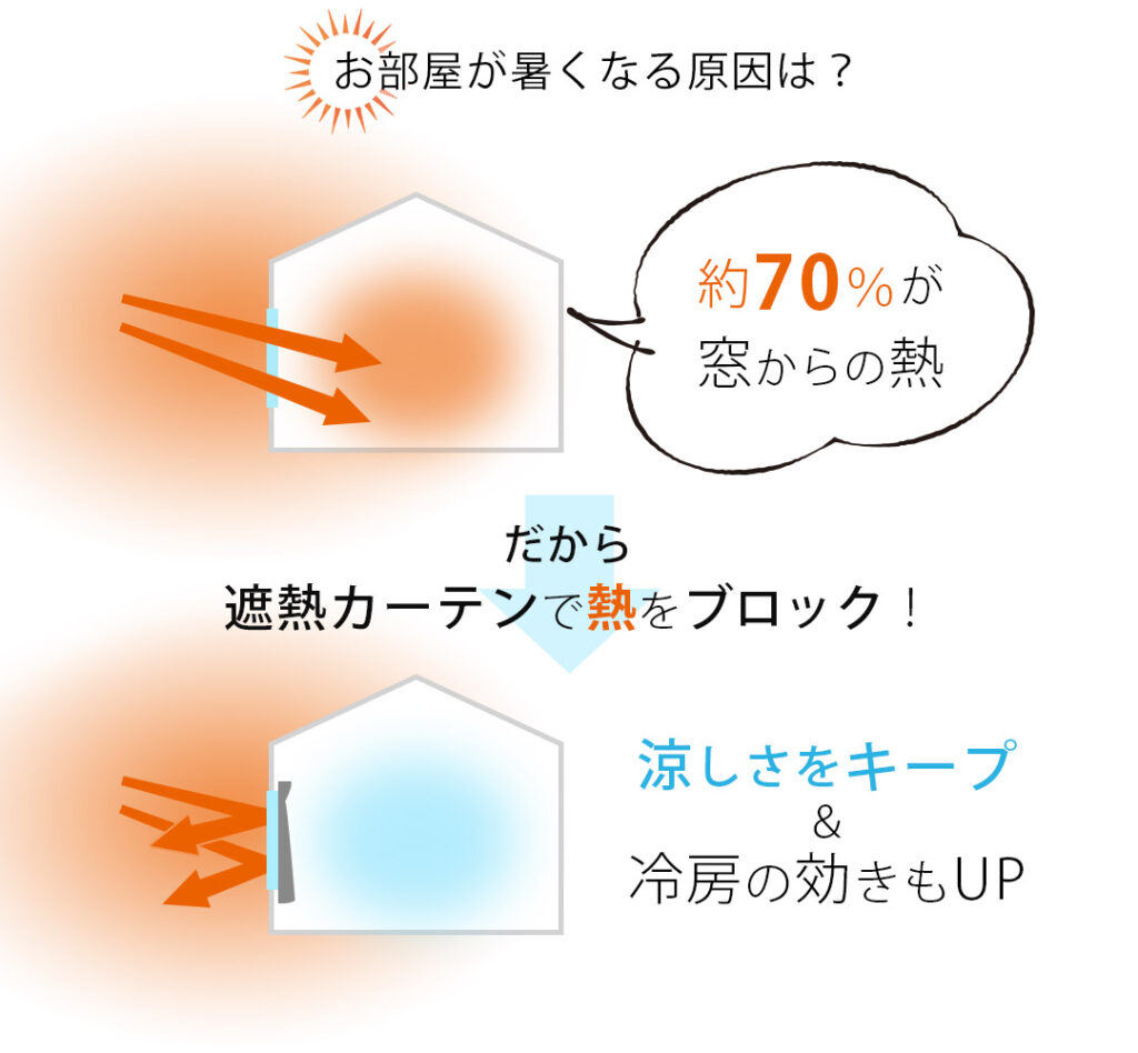 遮熱カーテンとは、窓からの熱をさえぎることで、お部屋の温度上昇を抑制し、