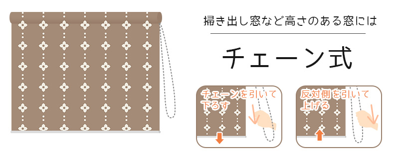 一方、チェーン式は、サイドのチェーンを操作して開閉するタイプで、大きな窓や重さのある生地でも軽い力で操作できるのが利点です。