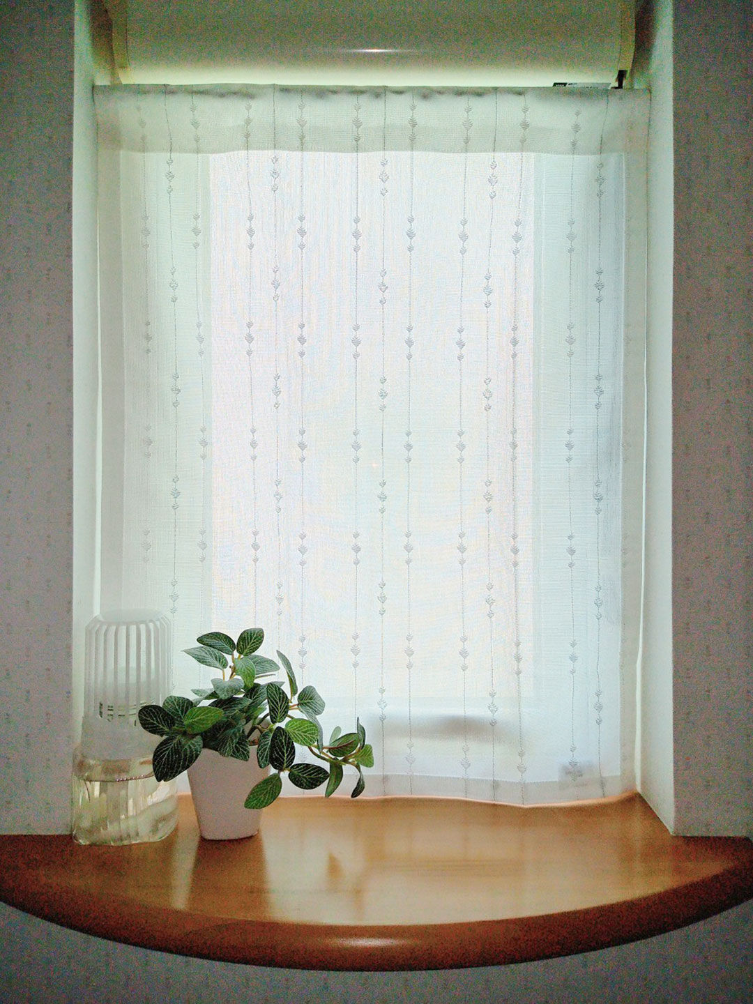 フラットタイプの窓幅ぴったりにしたから、ストライプのさりげない刺繍がよく見えてスッキリおしゃれなトイレになりました。