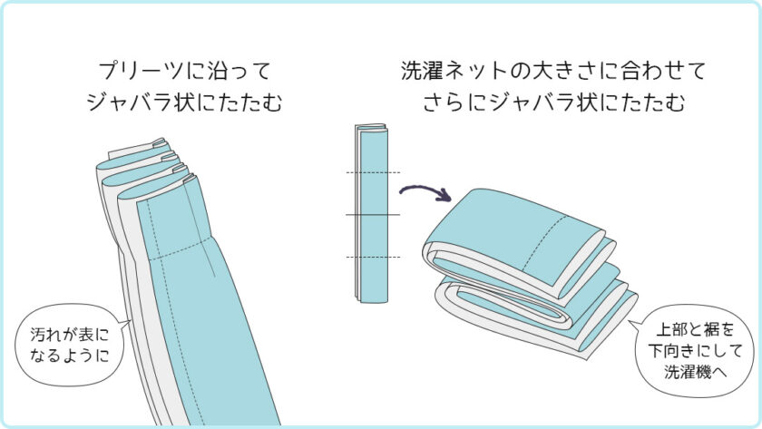 フックを取り外し、たたんでから洗濯ネットに入れる