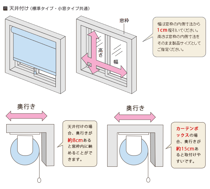 壁がスッキリする天井付け(窓枠内側やカーテンBOXに設置)の場合は、